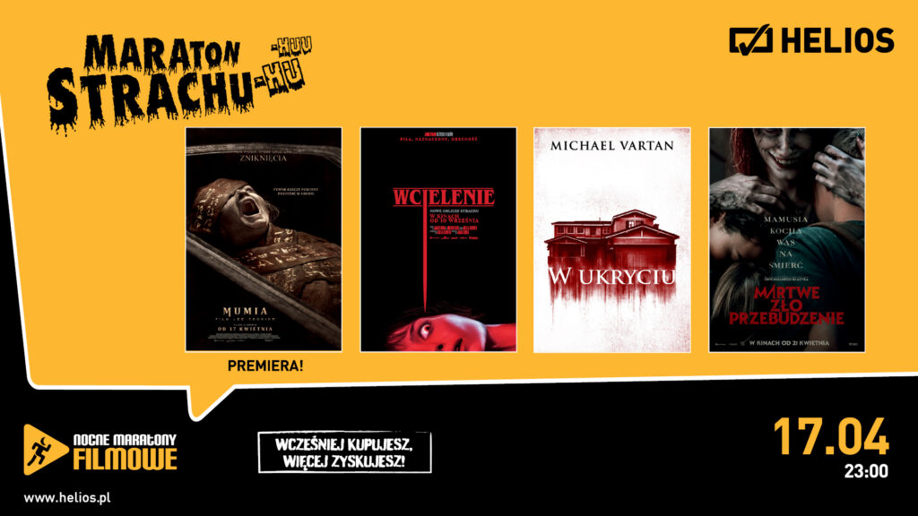Dla fanów mocnych emocji Helios przygotował Maraton Strachu, który rozpocznie się w piątkowy wieczór, 17 kwietnia. To nocne wydarzenie dedykowane miłośnikom horrorów, rozpoczynające się premierowym seansem filmu „Mumia: Film Lee Cronina”. Następnie w poniedziałek, 20 kwietnia, w wybranych kinach sieci odbędzie się pokaz w ramach cyklu Kino Konesera. Na ekranach pojawi się „Tajny agent” – brazylijski film czterokrotnie nominowany do Oscara, który przenosi widzów do realiów lat 70. i opowiada historię człowieka uciekającego przed własną przeszłością w cieniu wojskowej dyktatury. Z kolei w środę, 22 kwietnia, Helios zaprasza do wybranych lokalizacji na wyjątkowy seans kultowego filmu „Żywot Briana” z błyskotliwym humorem grupy Monty Pythona.